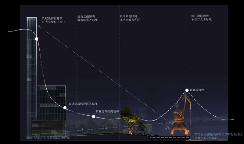 楊浦濱江段燈光設計由前景濱河帶燈光,中景重點建筑照明,和遠處建筑燈光為背景組成三層立體濱水燈光環境。