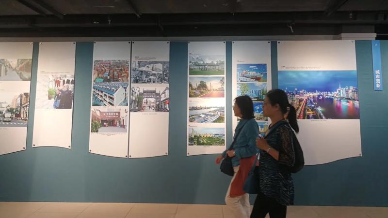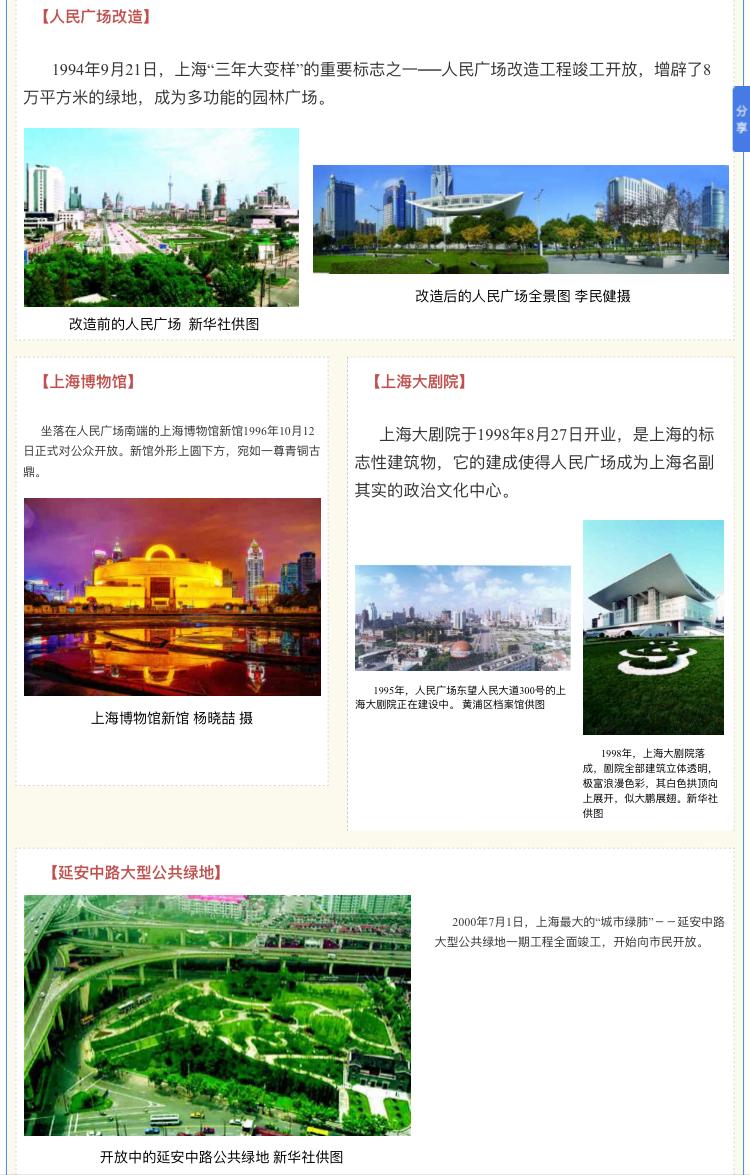 展覽中,有一組圖片集中反映了人民廣場一帶在上世紀90年代的變化:1994年9月21日,人民廣場改造工程竣工開放,增辟了8萬平方米的綠地,成為多功能的園林廣場;坐落在人民廣場南端的上海博物館新館在1996年10月12日對公眾開放,新館外形上圓下方,宛如一尊青銅古鼎;上海大劇院于1998年8月27日開業,是上海的標志性建筑物,它的建成使得人民廣場成為上海名副其實的政治文化中心;2000年7月1日,上海最大的“城市綠肺”——延安中路大型公共綠地一期工程全面竣工,向市民開放。