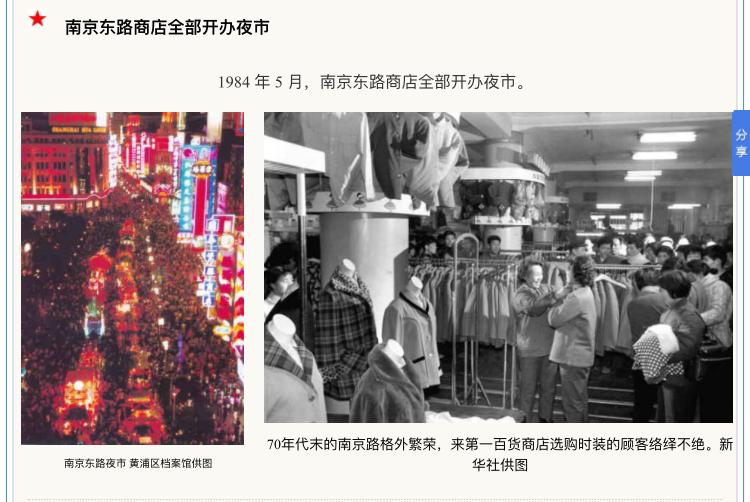 南京東路素有“中華商業第一街”美譽。每當入夜,南京東路上燈火輝煌、無比璀璨;但在上世紀80年代之前,有段時間,南京東路上的大部分商店都關門很早,不少消費者反映,下了班沒有地方買東西。于是,1984年5月,南京東路商店全部恢復了夜市,一時“十點打烊”成了南京東路商業服務消費者的標志。