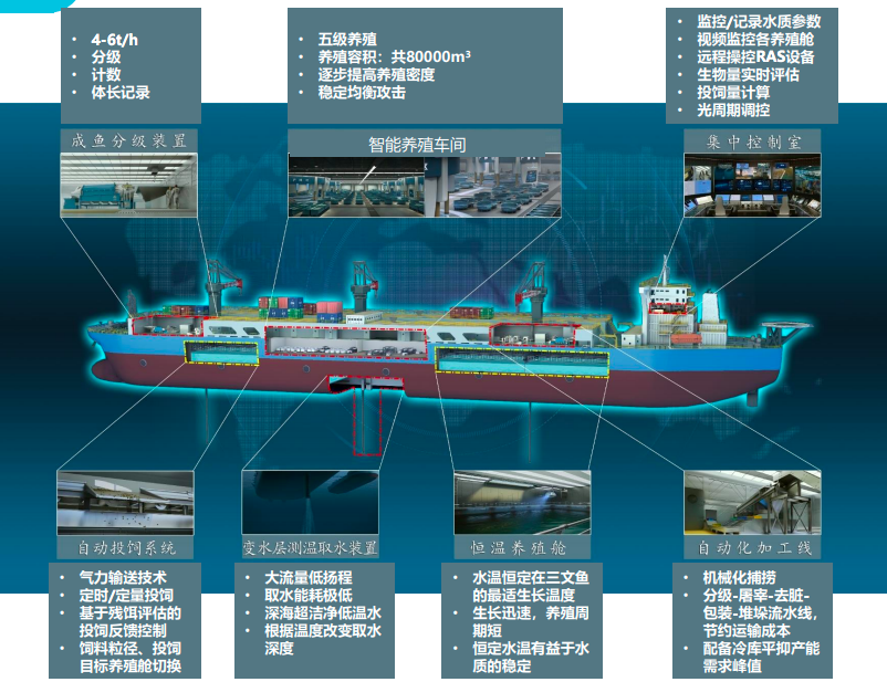 同時,“智漁工廠”還將建設萬噸級海上示范中試養殖加工平臺和十萬噸級海上示范養殖加工平臺。其中,深遠海養殖加工平臺以10萬噸級船為母型研發,可提供近8萬方養殖水體,單平臺年產三文魚7000-9000噸,產值約10億元,養殖品種還可以拓展到金槍魚、黃條鰤、大黃魚等。
