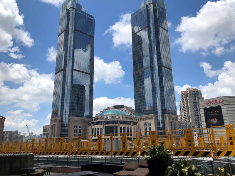 建設中的徐家匯連廊一期,畫面遠處為正在更新改造中的港匯恒隆廣場
