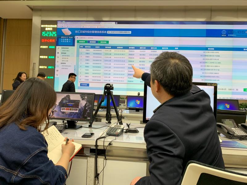 小年夜下午,徐匯城市網格化綜合管理中心副主任盧義耀(右)向記者講解徐匯城市綜合管理信息系統的使用情況