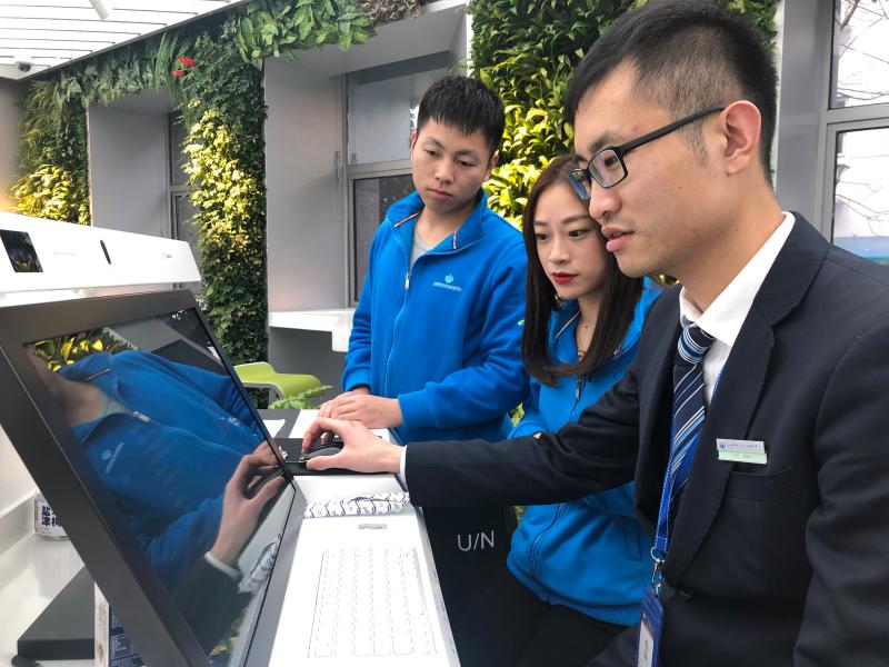 24小時自助服務大廳服務臺工作人員歐陽智耀(右一)與設備供應商調試自助設備系統