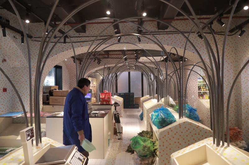 菜場用不同的馬賽克巧妙拼接,將菜場分成不同的區域,向四周發散的拱形金屬支架讓并不大的菜場空間感十足。