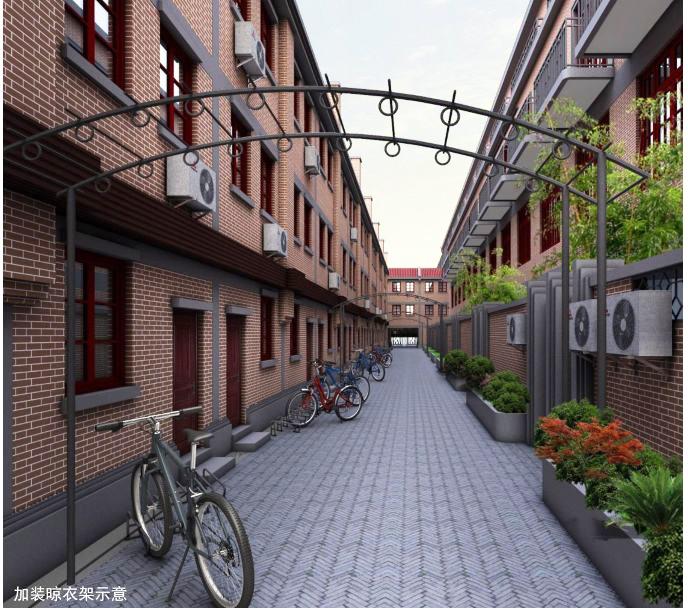 現有小區地面多有起砂、開裂和破損現象。本次修繕時,將對小區地面鋪設青灰石板磚,與里弄房屋整體風格更為協調;道路兩側與房屋相接處采用灰色花崗巖進行收邊,并留有排水溝。在小區兩條正對大門的主弄交叉路口地面,采用中式傳統拼花圖案,石刻浮雕,或“樂”、“福”等寓意較好的文字。也將對小區內現有的各種裸露架空線外部加裝條形格柵鋁合金電纜罩,表面噴涂氟碳烤漆。同時將原先居民自行搭建的晾衣桿拆除,加裝樣式統一的不繡鋼落地式晾衣桿。