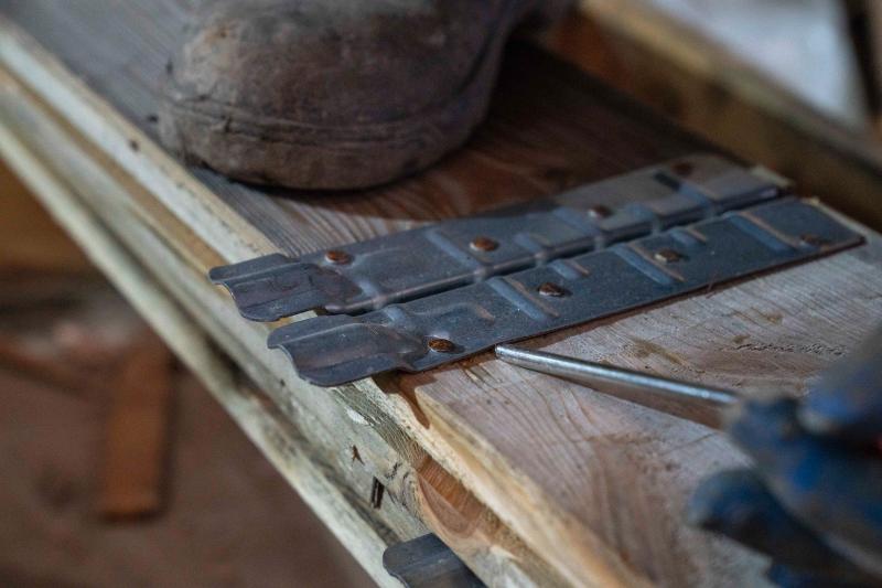 工人將廢舊家具上的金屬附著物、皮套等非木制品進行拆除。