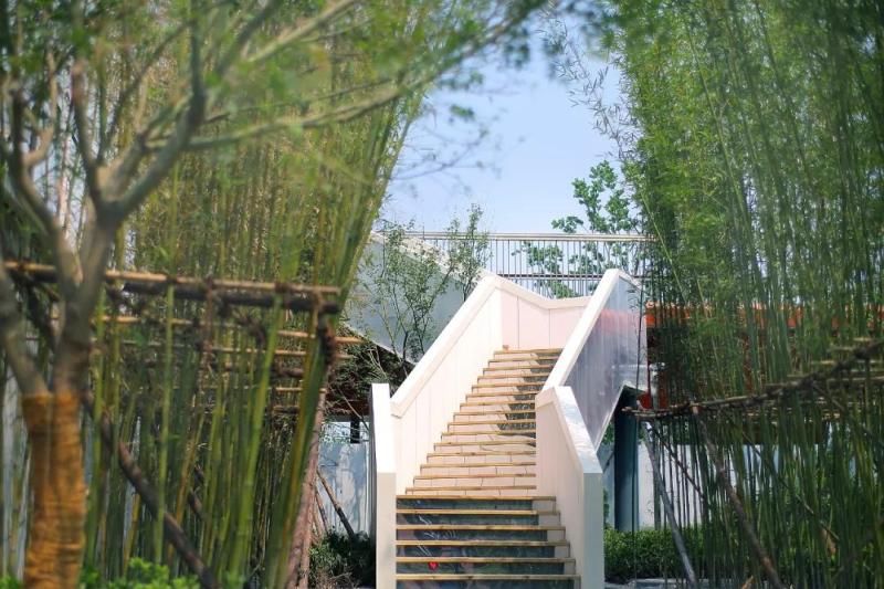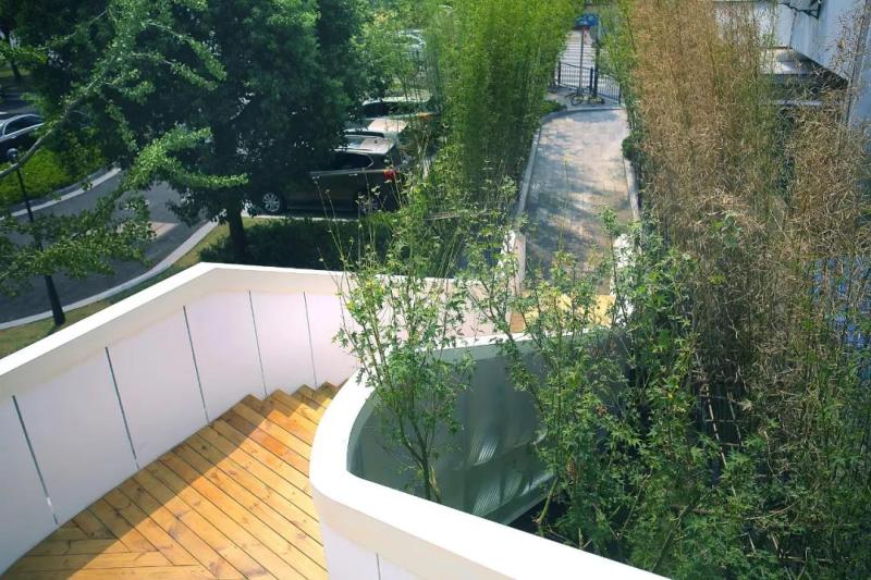 為了讓人們更為方便地到達這個空中的“城市客廳”,特地設計了一座蛇形發光樓梯實現步行通達。蛇形彎曲的形式在有限的空間,實現了坡度舒緩和形式優美,人們的行走體驗也更為舒適。樓梯配合兩側小青竹,點綴了三棵青楓,創造一個比較偏園林化的感受。