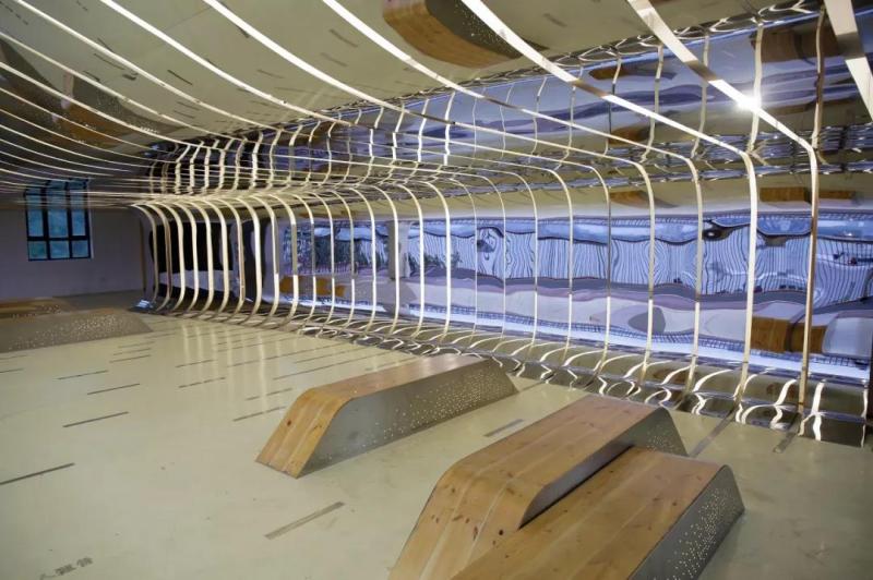 通過一線鏡面材料,在空間上曲線柔和地過渡,將頂棚、墻面、地面都聯系起來,一一對應的直線,如同鋼琴曲譜一般,簡單而有趣。