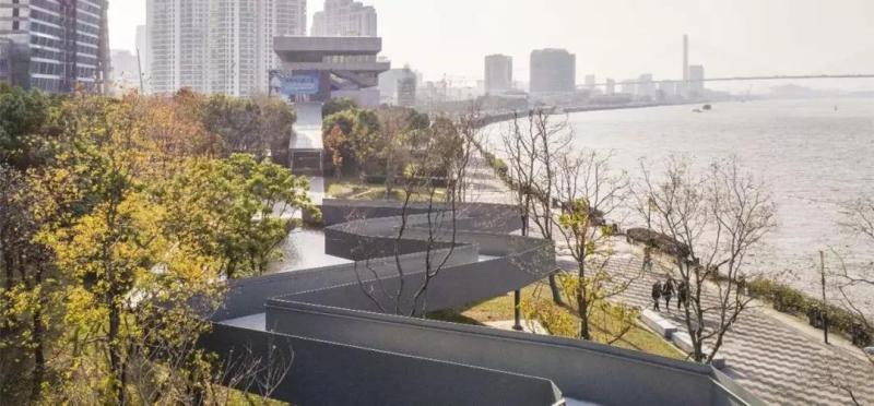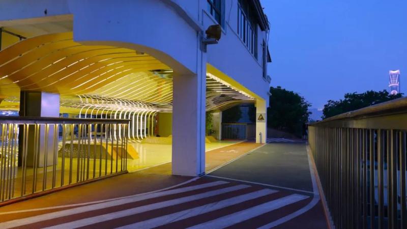 蛇形樓梯同樣延續了這一簡潔的設計語言,在平面上也是一個鋼琴曲譜,同樣會在晚上煥發出美麗的光。在向生活性空間轉型時,設計師在環境細節上打磨推敲,試圖呈現歲月的記憶。人們可以在地面上發現關于輪渡、關于濱江發展的印記。