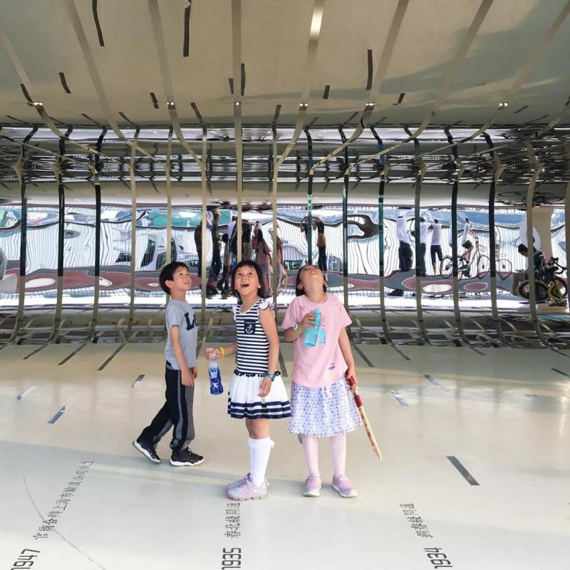 “浦江之鏡”開放使用后,許多小朋友來這里玩耍,他們會抬頭看頂棚上的自己,會對這墻面的鏡子躲貓貓,家長們則忙著給孩子們拍照,一幅其樂融融的場景。