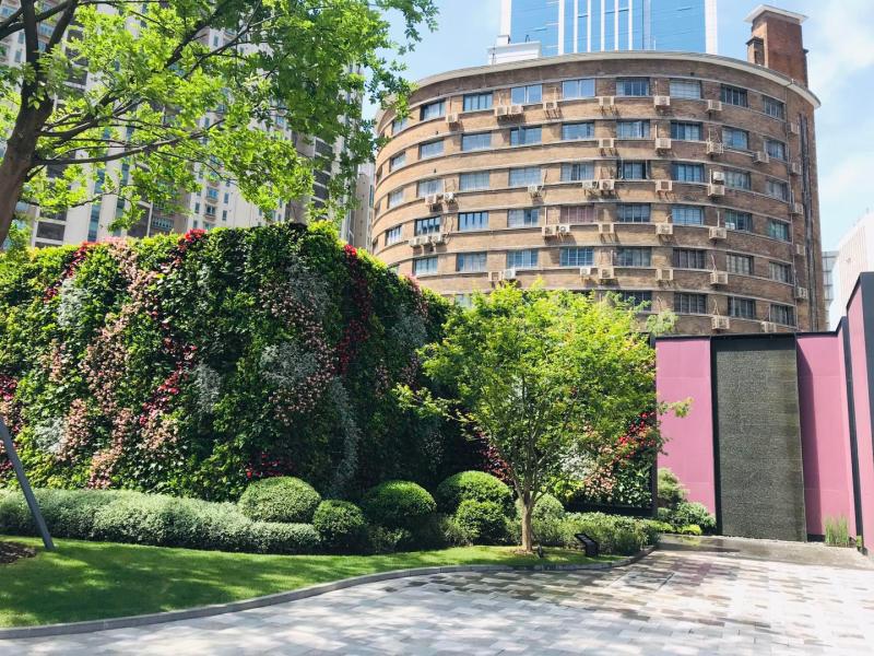 變電站出入口功能需要被保留,但地面部分被精心包裹在立體綠化墻內,基礎設施的功能性、協調性與觀賞性相結合;立體綠化墻上的綠植與花卉借鑒歐洲模紋花壇的形式,拼接出色彩斑斕的幾何圖案,與周邊歷史建筑本體上的紋理相協調;立體綠化墻、幕墻等圍合出一個優雅精致的城市庭院,走進去別有洞天,造景紅楓、樸樹與紫焰狼尾草、西洋鵑、絲蘭、苔草等各色植物交相輝映。