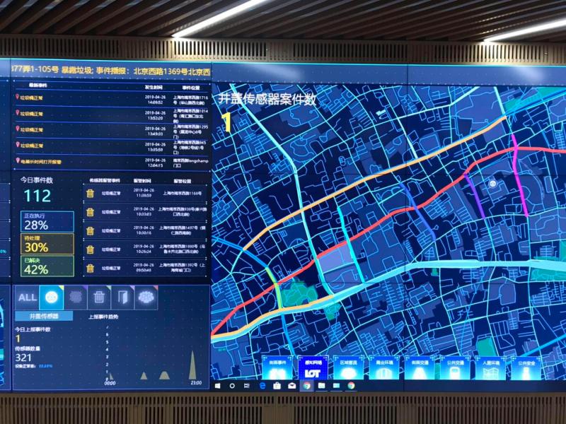 目前,在南京西路沿線以及周邊4公里后街區域內,街面與公共設施上安裝著數百個感應器,對窨井蓋移位和積水、電箱門磁開關、果皮箱滿溢、道路揚塵等公共部件、事件進行實時報警;通過視頻監控和wifi技術,收集路面人流數據、路段車流情況,分析人流潮汐規律,精確計算波峰和波谷的具體時間點,科學投放管理力量;通過系統數據交換,對市政市容作業、城管作業開展實時調度指揮。